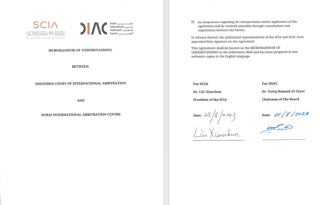 深圳国际仲裁院(SCIA)和迪拜国际仲裁中心(DIAC)为加强全球仲裁服务建立战略合作关系