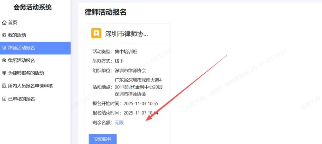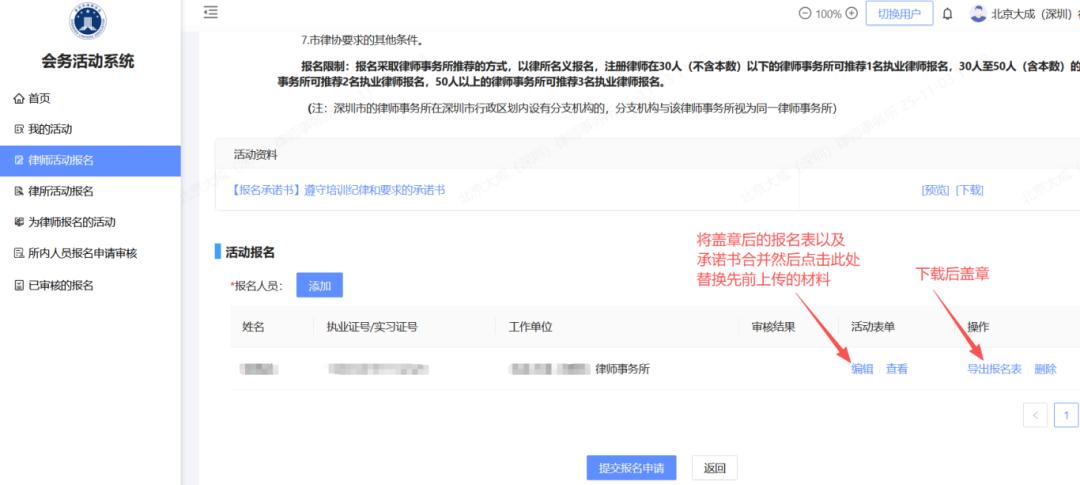 备注:具体操作方式详见下方操作指引,未将加盖律所公章的《活动报名表》和律师本人签字并加盖律所公章的《遵守培训纪律和要求的承诺书》上传至报名系统的,视为报名不成功。