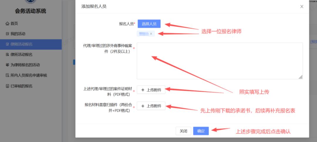 第三步:将加盖律所公章的《活动报名表》和《遵守培训纪律和要求的承诺书》扫描成一个PDF文件,案件证明材料另附,以“所名+姓名+涉外商事仲裁班”命名上传至报名系统,最后再点击提交报名。