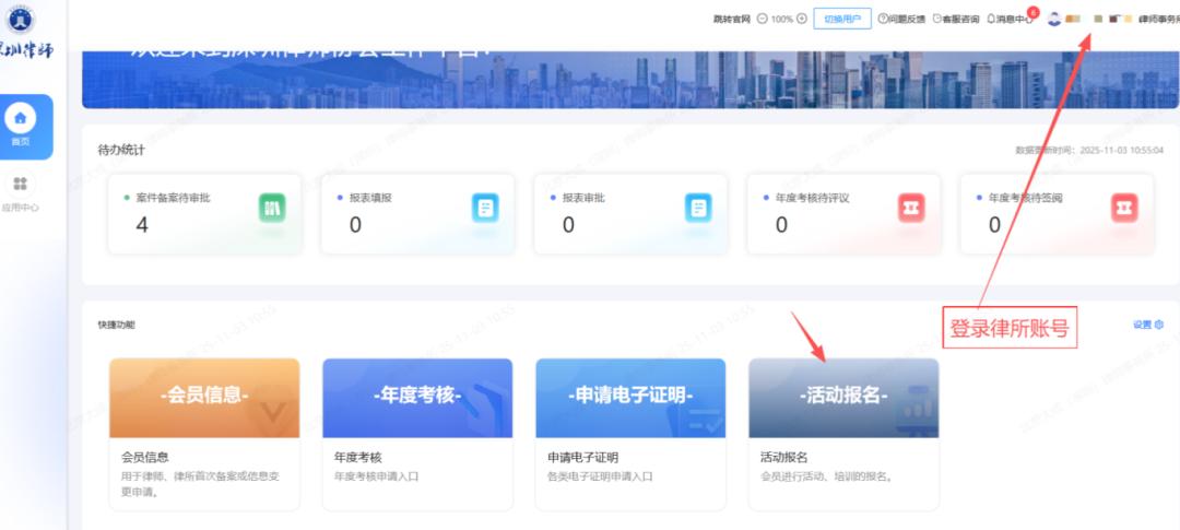 第一步:通过浏览器打开“涉外商事仲裁班”报名入口:https://event.szlawyers.com/#/event-registration,以律所账号登录会员系统,进入“律师活动”报名系统(一次只能提交一名律师信息),按照指引填写报名材料(如实填写代理涉外商事仲裁案件/审理涉外商事仲裁案件名称,2件及以上),下载活动报名表并加盖律所公章。