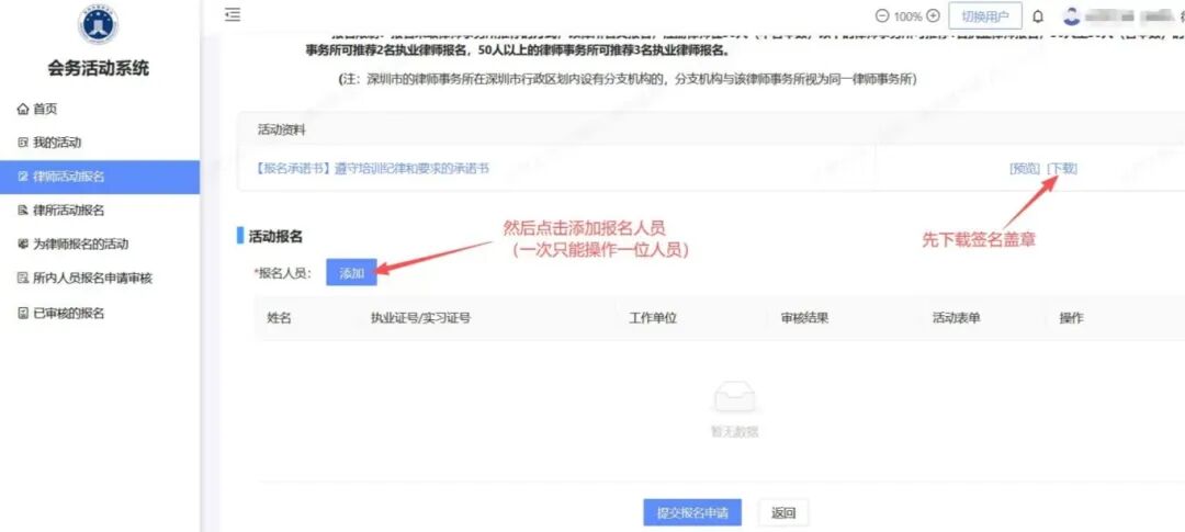 第二步:打印报名系统内的附件《遵守培训纪律和要求的承诺书》,报名律师本人签字并加盖律所公章。未签名或未加盖律所公章的视为不符合报名条件。