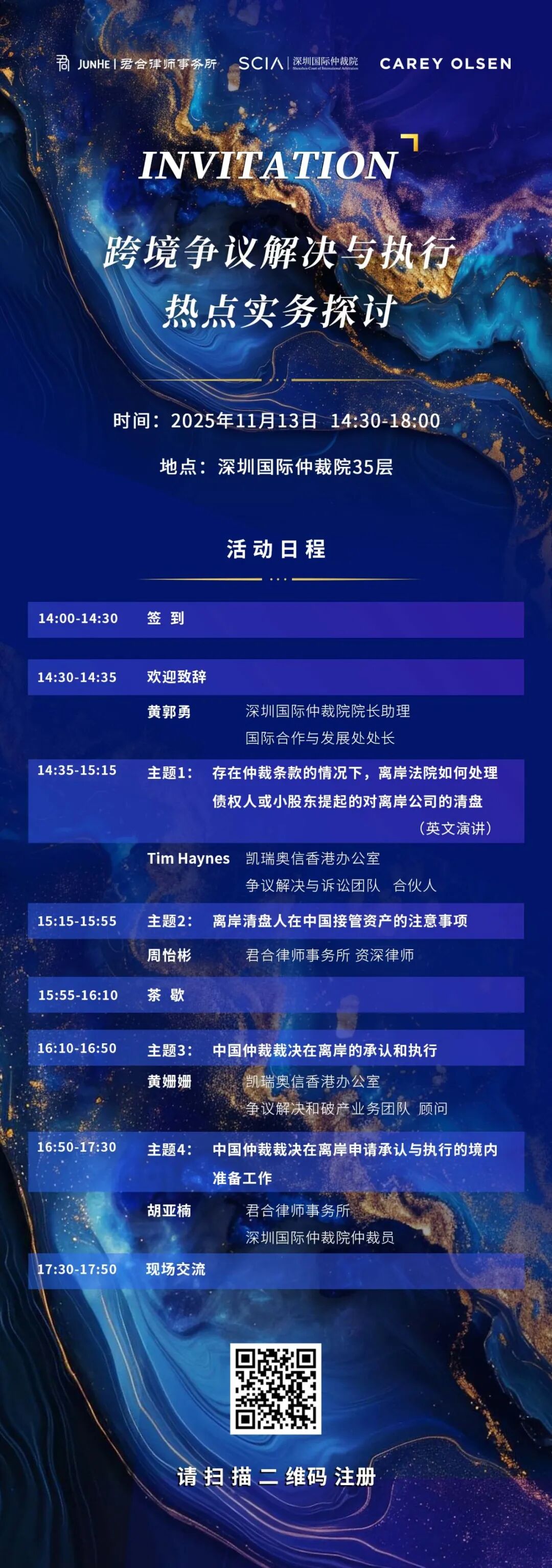 2025年11月13日下午14:30-18:00,由深圳国际仲裁院(SCIA)支持,君合律师事务所与凯瑞奥信(Carey Olsen)律师事务所联合举办的“跨境争议解决与执行:热点实务探讨”活动将在深圳国际仲裁院35层举行。