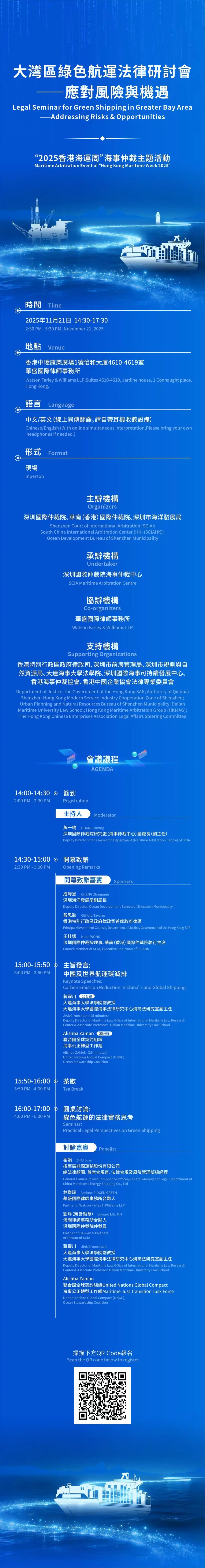 一年一度的香港海运周即将来临,由深圳国际仲裁院(又名华南国际经济贸易仲裁委员会、粤港澳大湾区国际仲裁中心,英文简称“SCIA”)与华南(香港)国际仲裁院(英文简称“SCIAHK”)联合主办的“2025香港海运周”海事仲裁主题活动“大湾区绿色航运法律研讨会——应对风险与机遇”将于2025年11月21日在香港召开,本次活动聚焦中国及世界航运碳减排、绿色航运的法律实务和理论思考,诚邀粤港澳大湾区海事海商领域产业界和法律界人士进行现场交流,活动信息如下: