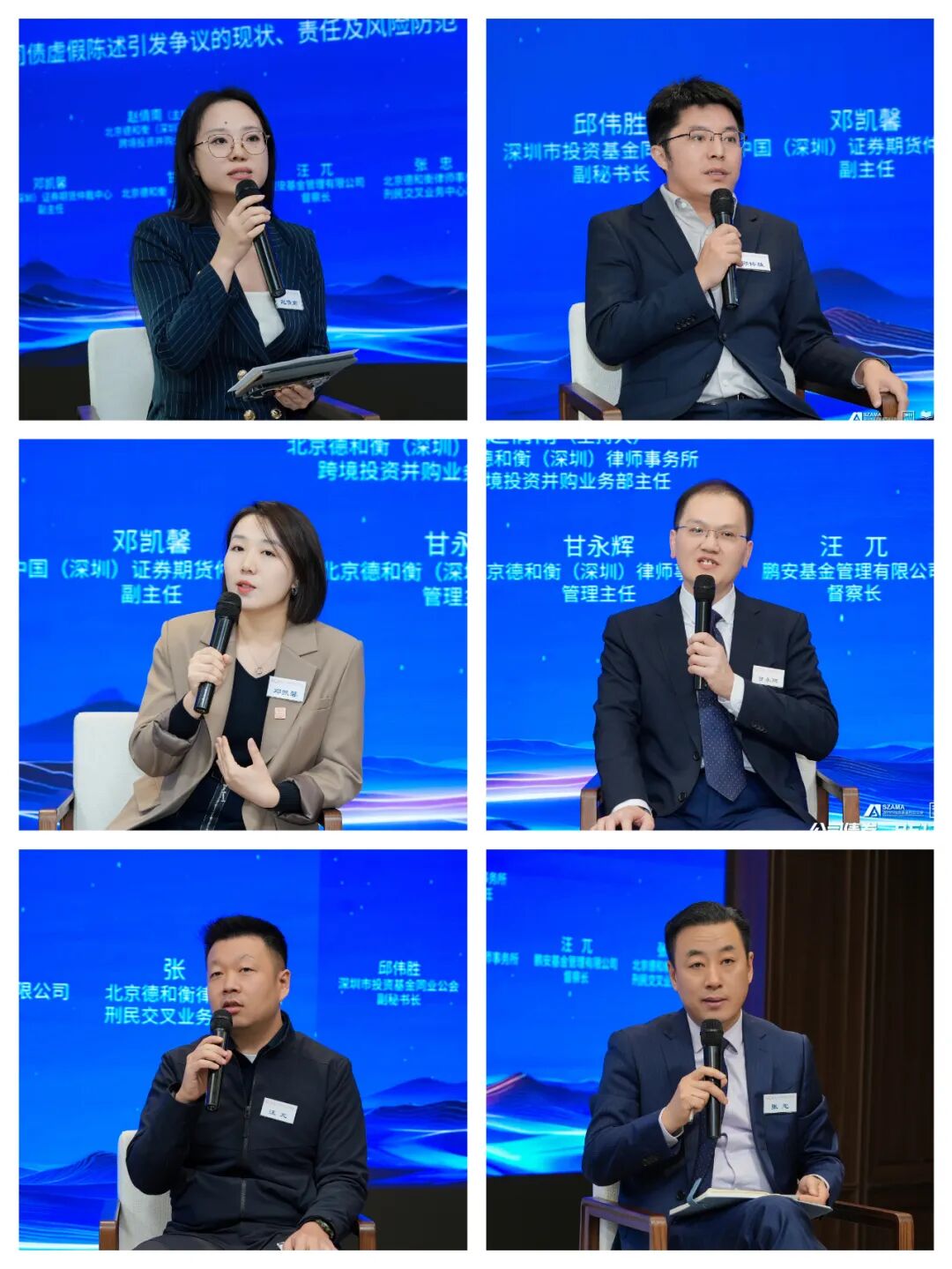 “圆桌讨论:公司债虚假陈述引发争议的现状、责任及风险防范”环节由北京德和衡(深圳)律师事务所跨境投资并购业务部主任赵倩南主持,深圳市投资基金同业公会副秘书长邱伟胜、中国(深圳)证券期货仲裁中心副主任邓凯馨、鹏安基金管理有限公司督察长汪兀、北京德和衡(深圳)律师事务所管理主任甘永辉、北京德和衡律师事务所刑民交叉业务中心总监张忠参与讨论