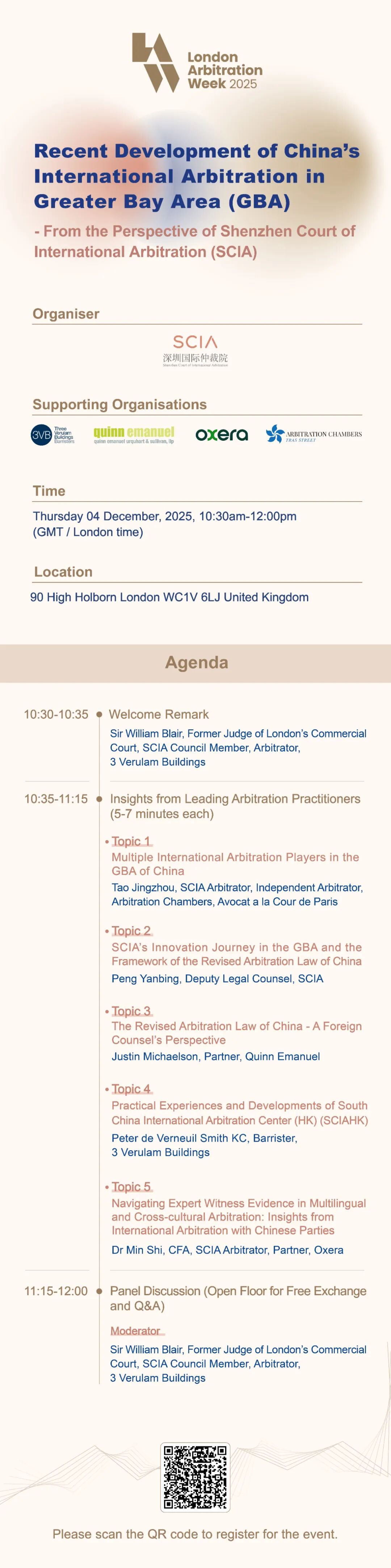 2025年伦敦仲裁周(London Arbitration Week)期间,由深圳国际仲裁院(又名华南国际经济贸易仲裁委员会、粤港澳大湾区国际仲裁中心,英文简称“SCIA”)主办的专题活动Recent Development of China’s International Arbitration in Greater Bay Area (GBA) - From the Perspective of Shenzhen Court of International Arbitration (SCIA)将于伦敦时间12月4日(周四)上午10:30–12:00在伦敦举行。SCIA理事会理事、伦敦商事法院前大法官、独立仲裁员Sir William Blair将出席致辞。本次活动邀请中外专家围绕中国国际仲裁的最新发展及大湾区争议解决实践展开交流,诚邀您参加!