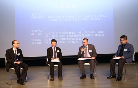 第一环节“上市公司并购重组热点法律问题”由深圳证券交易所法律部总监付彦仲裁员主持。证监会上市部副主任陆泽峰、中联重科集团副总裁兼总法律顾问孙昌军、赛富亚洲投资基金管理公司合伙人兼法务总监谢学军仲裁员、最高院执行局副局长金剑锋、金杜律师事务所合伙人张保生、华南国仲秘书长刘晓春分别从监管、企业发展、创投资本、法院、律师及完善争议解决机制的角度,就上市公司并购重组的相关法律问题作了专题发言,聚焦上市公司并购重组中的法律风险及防范并提出对策。证监会行政处罚委副主任审理员欧阳振远仲裁员作为本环节的主评人,与北京大学法学院副院长郭雳仲裁员、红杉资本中国基金法务总监张联庆及天元律师事务所合伙人吴冠雄一同对第一环节作了点评。