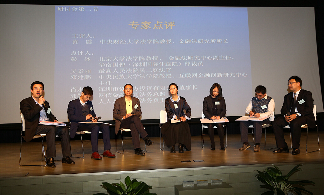 第二环节“互联网金融前沿法律问题”由中国平安集团首席律师、华南企业法律论坛主席姚军仲裁员主持。北京大学法学院教授、金融法研究中心副主任彭冰仲裁员,最高院民二庭吴景丽法官,阿里蚂蚁金服集团法务及合规部高级法律专家王莹,招商银行总行法律与合规部副总经理黄斌仲裁员,银监会创新监管部综合处处长蒋则沈,宜信公司法务总监晨光和腾讯集团助理总法律顾问王小夏仲裁员则围绕互联网金融法律问题同与会人员分享了自己的观点。中央财经大学法学院教授、金融法研究中心主任黄震是本环节的主评人,深圳创东方投资公司董事长肖水龙、网信金融公司法务总监郭勤贵、人人友信集团法务负责人邹丹莉、中央民族大学法学院教授邓建鹏分别对本环节作了点评,彭冰仲裁员、吴景丽法官也加入本环节作了补充和回应。