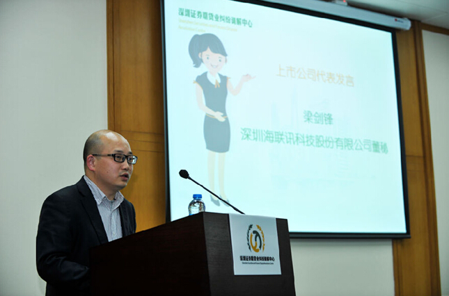 上市公司深圳海联讯科技股份有限公司董事会秘书梁剑锋先生发言,他指出海联讯公司去年发生虚假陈述事件,为保护投资者的利益,由中国证券投资者保护基金有限责任公司牵头,几方共同设立了投资者补偿专项基金,调解中心也全程参与了相关工作,不仅包括前期补偿方案合理性的调研论证工作,还包括受理不同意补偿方案的投资者提交的调解申请,为投资者解决纠纷提供了一条新路径,让投资者多了一种解决纠纷的选择。事实上,经调解中心调解员的专业、耐心调解,大部分海联讯纠纷得以妥善解决,感谢有调解中心这样好的机制。