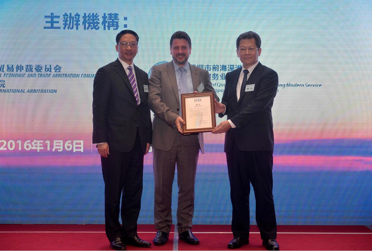 2016年1月6日下午,深圳国际仲裁院(又称“华南国际经济贸易仲裁委员会”,英文简称“SCIA”)与前海管理局在前海万科企业公馆特区馆共同举办了“SCIA香港仲裁员聘书颁发仪式暨培训会议”。