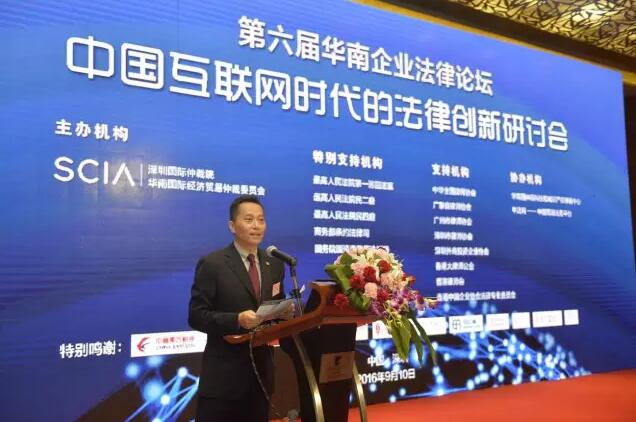 由深圳国际仲裁院(又名“华南国际经济贸易仲裁委员会”,英文简称“SCIA”)主办的第六届华南企业法律论坛“中国互联网时代的法律创新”研讨会于2016年9月10日在中国“创新之都”深圳召开。境内外300多家企业的高管和法务负责人与各级法院法官、仲裁员、调解专家、高校学者、专业律师及政府决策、监管部门的负责人共约500人,围绕互联网背景下法律领域的热点问题,深入展开探讨。