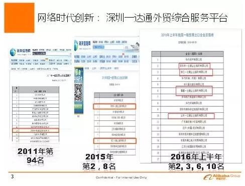 因为我们在深圳,所以不得不提深圳一达通,大家对阿里巴巴、淘宝、天猫比较清楚,但是有多少人知道一达通?深圳一达通跟深圳国际仲裁院有很好的合作,一达通是帮助中国的中小企业出口产品到海外。对于中小企业来说,不管中国或者海外,得到参与全球化贸易的商务机会,非常难得,也很复杂。其中涉及到物流、海关、外汇等等很多方面。一达通是帮助这些中小企业,完成这些工作。包括清关、退税、融资、保险、物流等等,正因为这些庞大的需求,一达通从2011年中国排名94位,上升到到2015年的第2和第8位。到今年上半年是第2、3、6、10名。现在一达通拥有1000多人的团队,这个是大家没有关注到的一个创新,也是网络时代一个很好的创新。