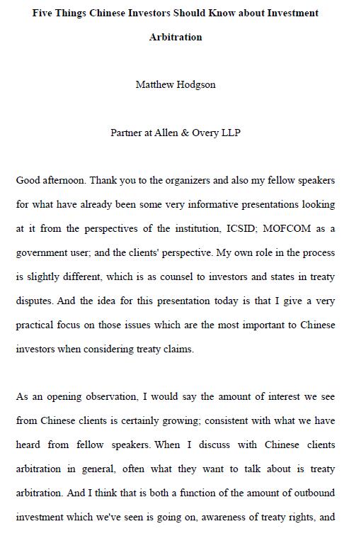 我自己的角色可能不太一样,我的工作是在条约争议中作为投资者或东道国的代理律师。我今天要分享的是关于投资仲裁的五个实务问题,也是中国投资者在对外投资的时候需要知道的五件事情。