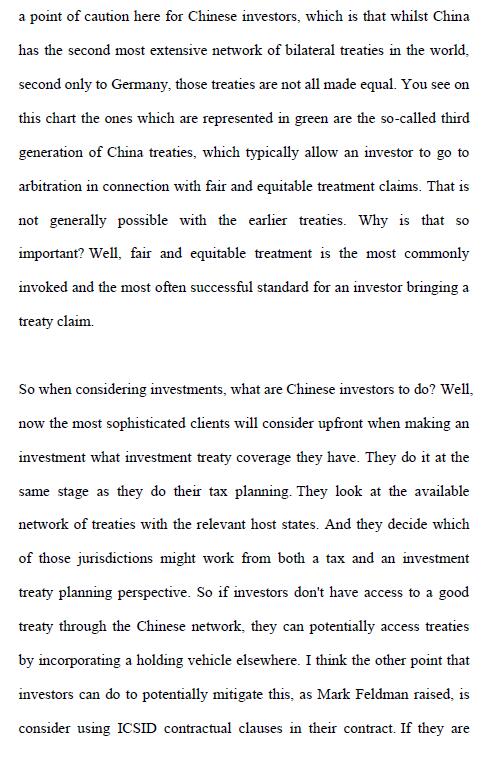 那中国投资者在考虑对外投资时,应该做些什么?最精明的投资者会在进行投资时首先考虑他们能受到哪些投资条约的保护,他们在做税务安排时也会同时考虑这个问题。他们会先考虑相关东道国的投资条约网络,然后从税务和投资条约的角度来决定选择哪一个法域进行投资。因此,如果投资者无法通过中国的投资条约网络获得满意的条约保护,他们可能会另辟蹊径。投资者可以采取的一个缓解这种不便的措施,正如Feldman教授所提到的,是考虑在与东道国签订投资合同时使用ICSID的合约条款。