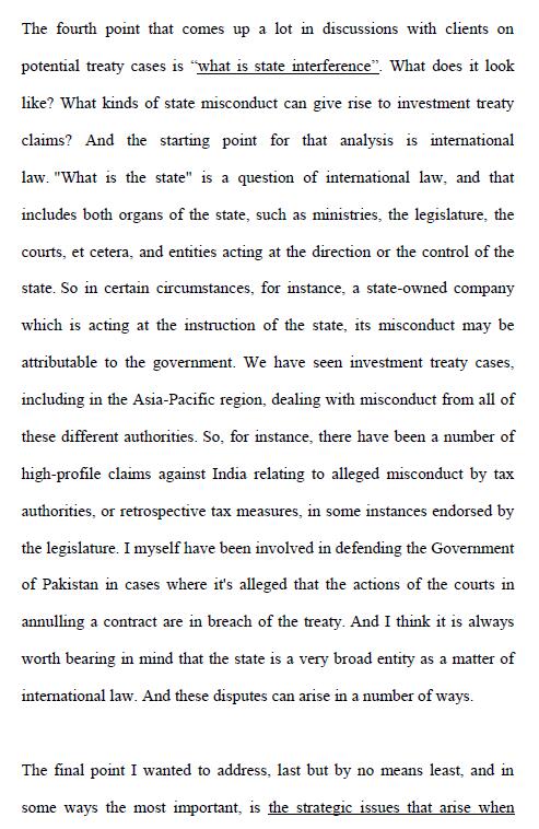第四点,也是一个我们经常讨论的问题,什么是国家干预?国家干预是什么样的?哪些类型的国家不当行为有可能导致投资协定争端?我们在国际法的框架下去讨论什么是国家干预。首先,“国家是什么”是一个国际法问题,国家既包括政府各部、立法机关、法院等国家机关,也包括接受政府指导和控制的法律实体。例如,在某些情形中,一家依政府指令而行为的国有企业,其不当行为可归责于政府。我们看到了包括在亚太地区的许多案例,由不同机构的干预而构成的案例。比如在印度有一些非常受关注的案件,就是指控税务机关不当行为而提出的一些诉求。我曾经代理过巴基斯坦政府,当时政府被诉,申请人指称法院撤销合同的行为是违反条约的。我觉得我们应该记住国家在国际法的框架下是一个非常宽泛的概念,国家干预可能有很多种形式。