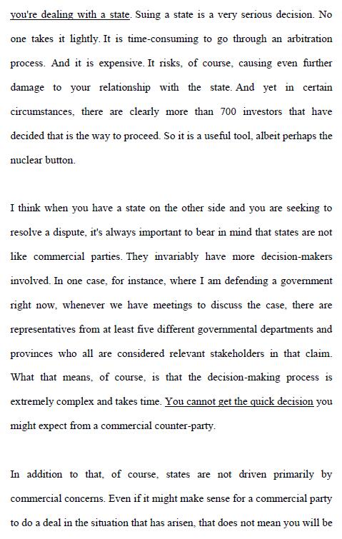 第五点,我想说的是,一个投资者在诉东道国时的策略问题。其实申请仲裁对抗一个国家是一件非常困难而且耗时、耗力、耗费金钱的事情。当然,其中的风险也很高,有可能会进一步伤害你跟这个国家的关系。即使有这么多的障碍,我们可以看到有700多个投资者还是义无反顾地选择申请仲裁。所以不难看出仲裁的价值,这是一个有用的工具,尽管可能是核按钮。我们必须明确的一点是,国家和一个公司是不一样的,国家总是有更多的决策者参与。比如说我现在正代理的一个政府,我每次要和他们协商一个事情的时候,他们必须要同时有来自五个政府部门的代表,他们都被认为是这个案件中的利益攸关者,这当然意味着决策过程会非常复杂。完全不能和与企业打交道时的快捷所媲美。