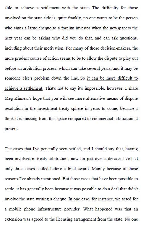 还有一个问题,国家不是以经济考虑来驱动的,这也是国家跟公司不一样的地方。即使以商业的角度来说达成某协议是有意义的,这并不意味着你将能够与国家达成和解。对于国家来说,对于政客来讲,没人想付一大笔钱给一个外国投资者,他可能会受到媒体的猛烈抨击。所以他们的考虑可能更多的不是在经济方面,而是在政治方面。对于很多决策者来说,他们倾向采取保守行动更希望争端在进入仲裁程序之前可以被时间消化掉,这有可能等上几年,所以在这样的环境之下,和解就愈加困难了。但是我们也不能完全否决和解的可能性,我跟Meg Kinnear的观点一样,未来我们可以看到更多的替代争议解决的方案,因为我认为与现在的商业仲裁相比,这个领域仍缺少争议解决手段。在我超过十年的争端解决经验中,我所知道的在最终裁决之前和解的案例只有3个,就是因为我之前提到的种种原因。而之所以能够和解,一般是因为这些和解方式没有涉及国家政府给投资者付一大笔钱的交易。有一个案例是,我们代理一家通讯工程提供商,关于国家下批的许可证的争议。这个案子能够和解是因为国家不需要支付现金。另一个争议是涉及不动产,得到和解的原因也是因为政府不需要支付现金。所以当我们在解决投资者与东道国争端的时候,必须要非常务实,你必须要预见到这个案子会耗费的时间以及金钱。任何解决方案都是一个挑战,通常需要一些创造性的思考来找到适合的解决方案。