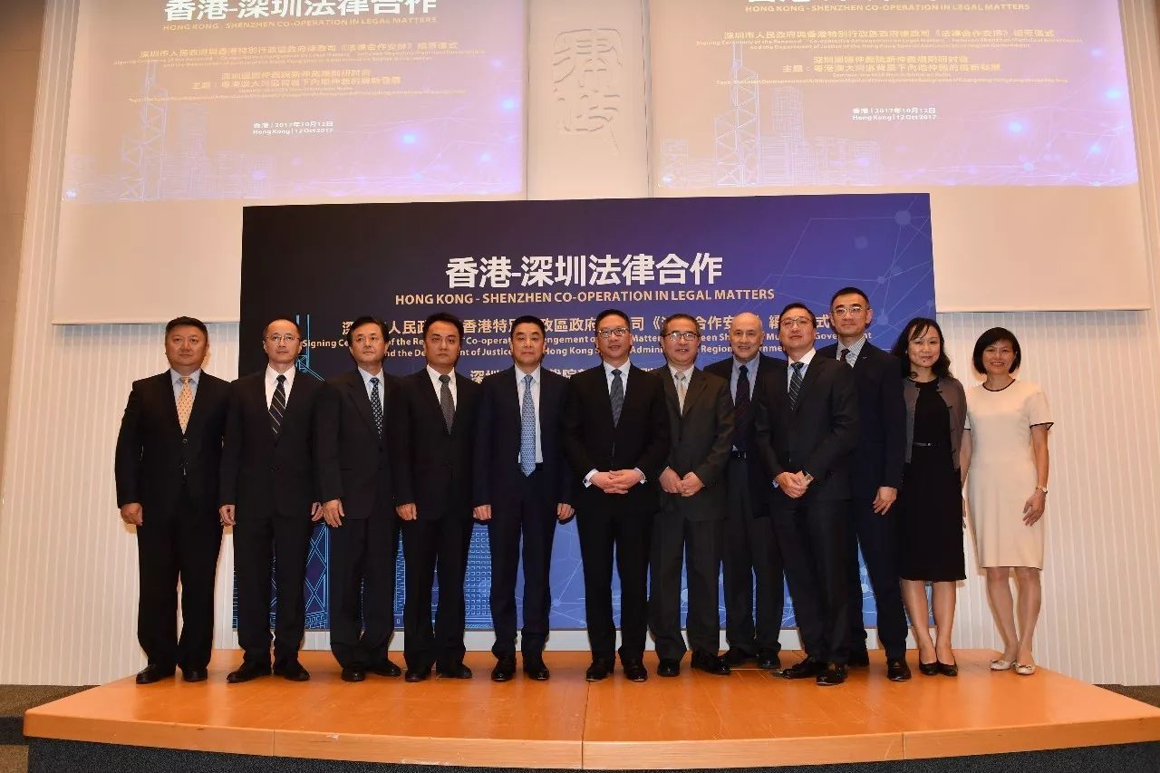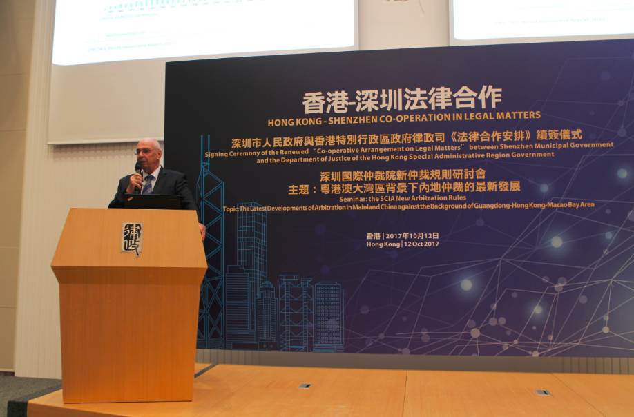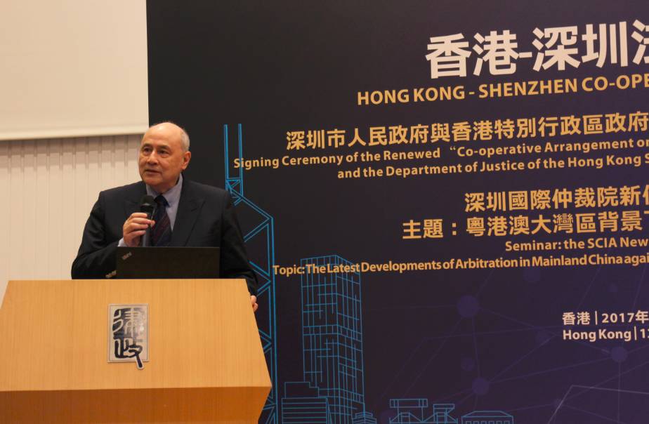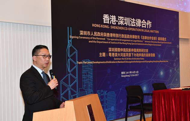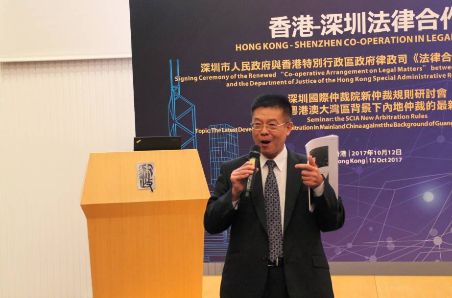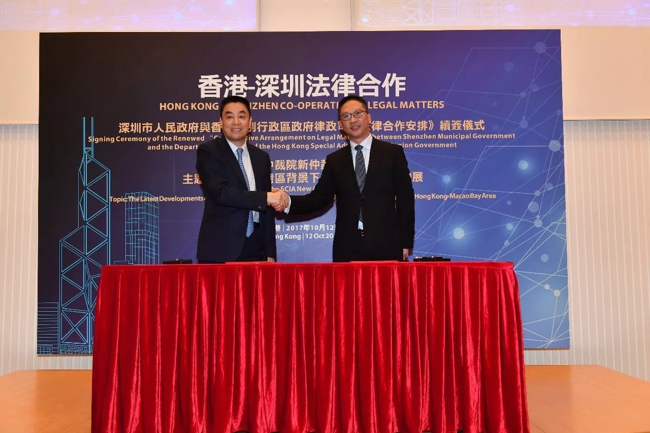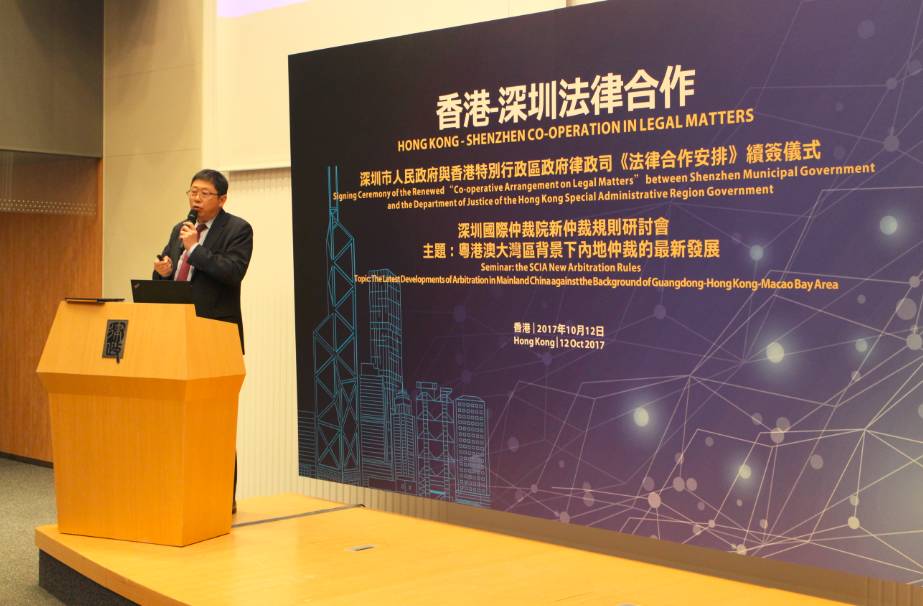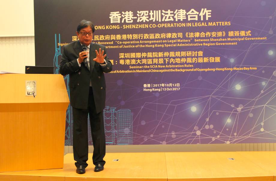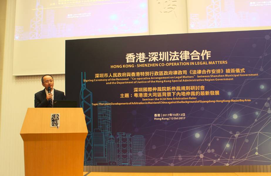 2017年10月12日,由深圳市人民政府、香港特别行政区政府律政司和深圳国际仲裁院(又名“华南国际经济贸易仲裁委员会”)共同举办的“深圳市人民政府与香港特别行政区政府律政司《法律合作安排》续签仪式暨深圳国际仲裁院新仲裁规则研讨会”在香港律政中心隆重举行。香港特别行政区政府律政司司长袁国强资深大律师、深圳市人民政府副市长高自民先生出席活动并致辞,深圳国际仲裁院院长刘晓春先生主持了主题为“粤港澳大湾区背景下内地仲裁的最新发展”的研讨会。