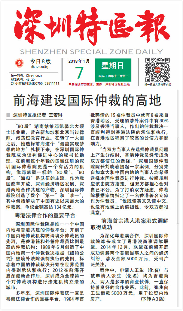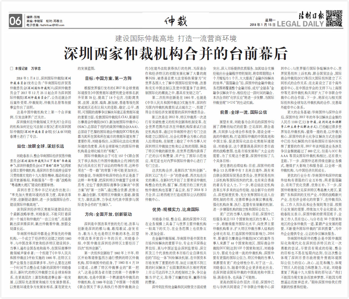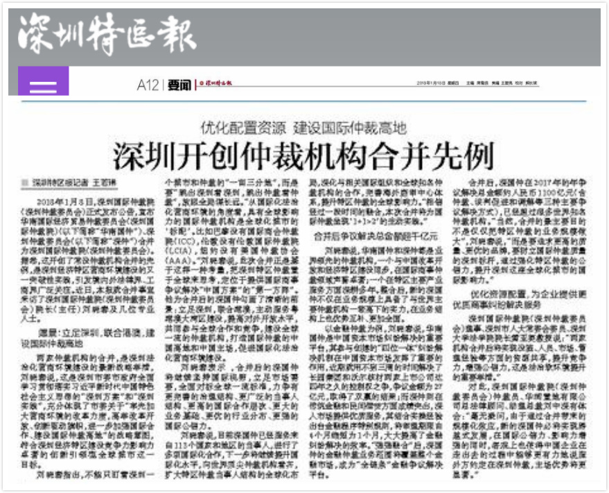 最近,深圳经济特区大力推动营造国际化市场化法治化营商环境,努力打造国际仲裁高地,相关改革和创新令人瞩目。今年,《深圳特区报》和《法制日报》分别于2018年1月18日、1月15日、1月7日刊发《深圳开创仲裁机构合并先例》、《深圳两家仲裁机构合并的台前幕后》、《前海建设国际仲裁的高地》等一系列文章,深入报道中国国际仲裁在深圳经济特区的最新发展。