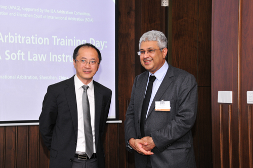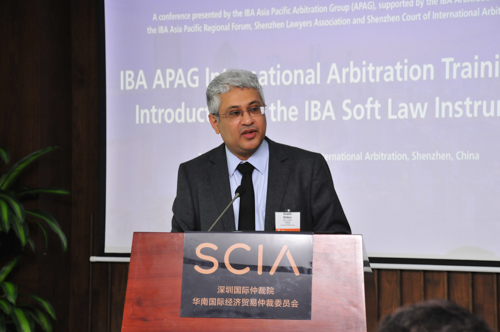 IBA亚太仲裁委员会联席主席Dinesh Dhillon先生和SLA副会长韩俊女士分别代表IBA和SLA致辞。Dhillon先生感谢SCIA和SLA对本次研讨会的大力支持,并表示虽然国际仲裁的参与者来自不同文化背景和法律传统,但公正是所有参与者的共同追求,也是国际仲裁的最终目的。韩俊女士介绍了SLA的基本情况,并表示本次研讨会是对深圳法律界的重要贡献,见证了IBA、SCIA和SLA之间友谊的崭新篇章。