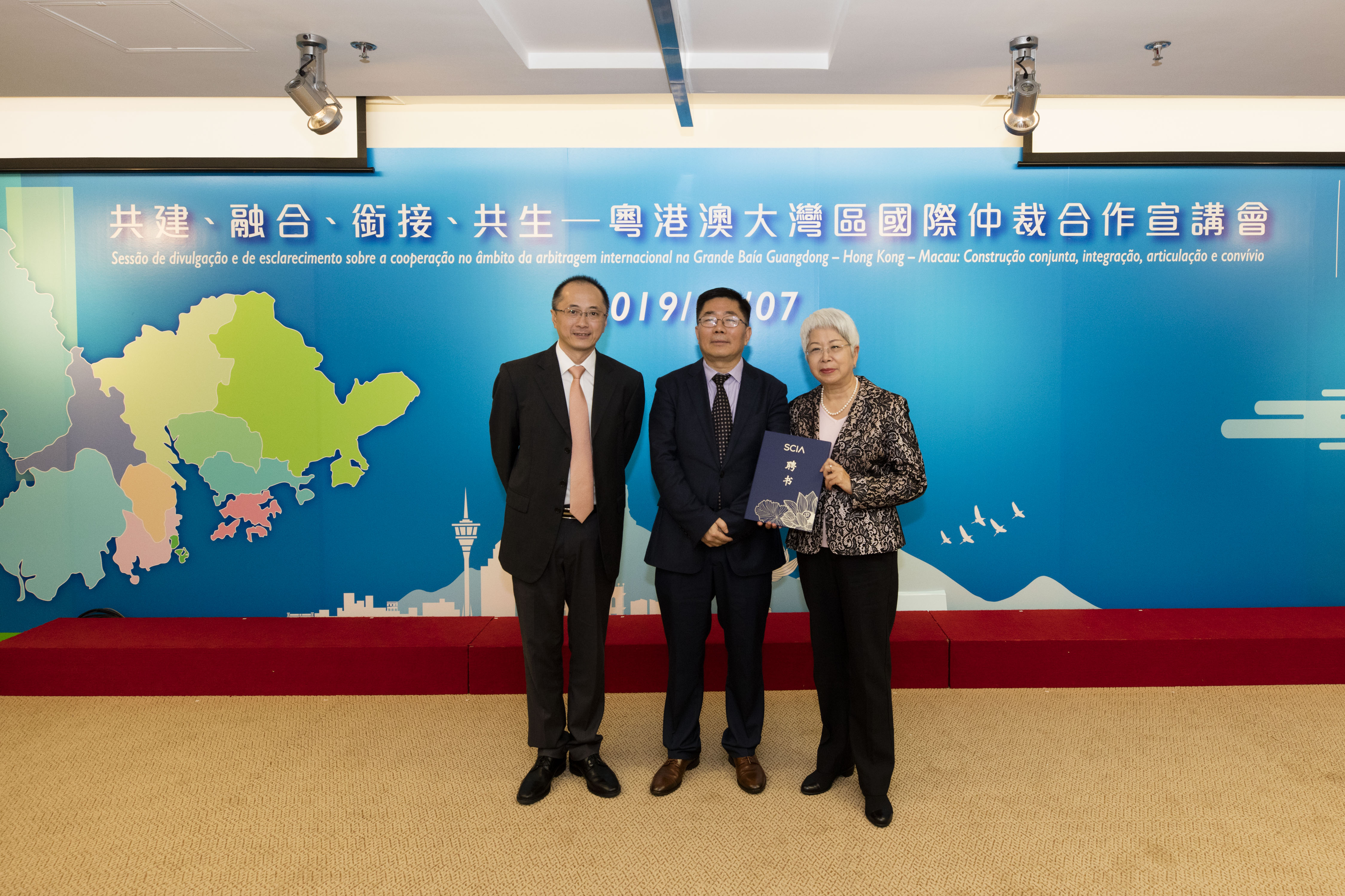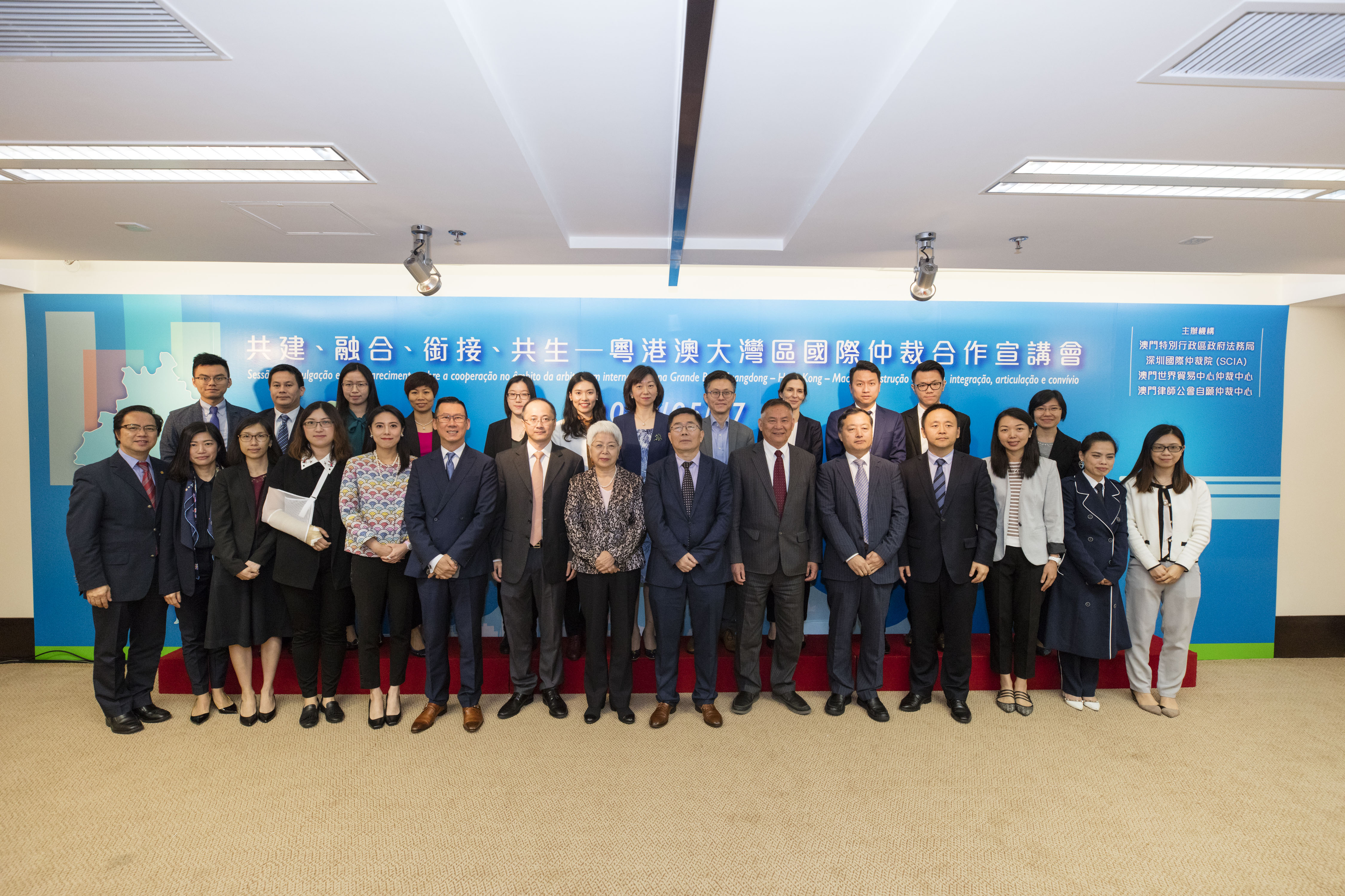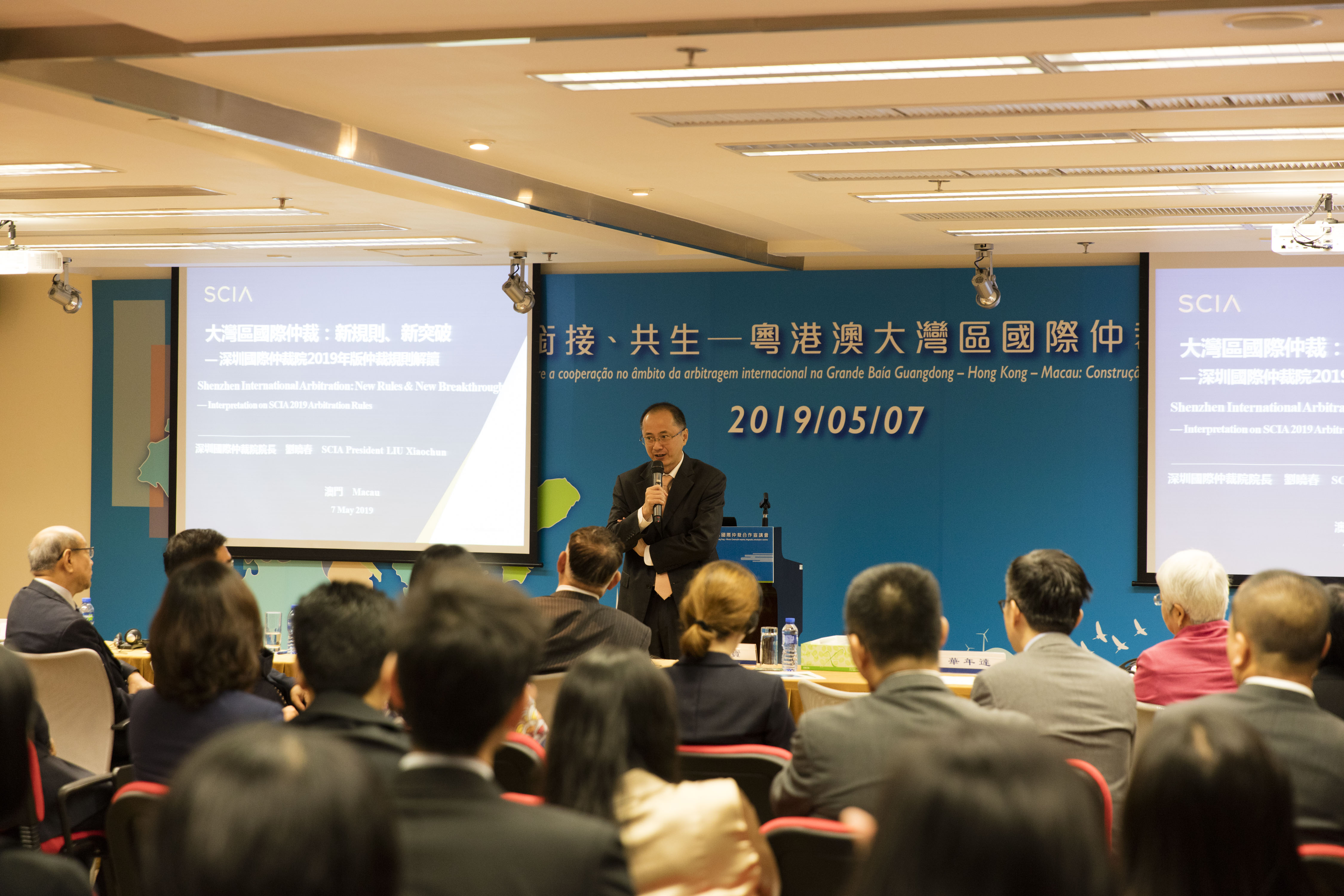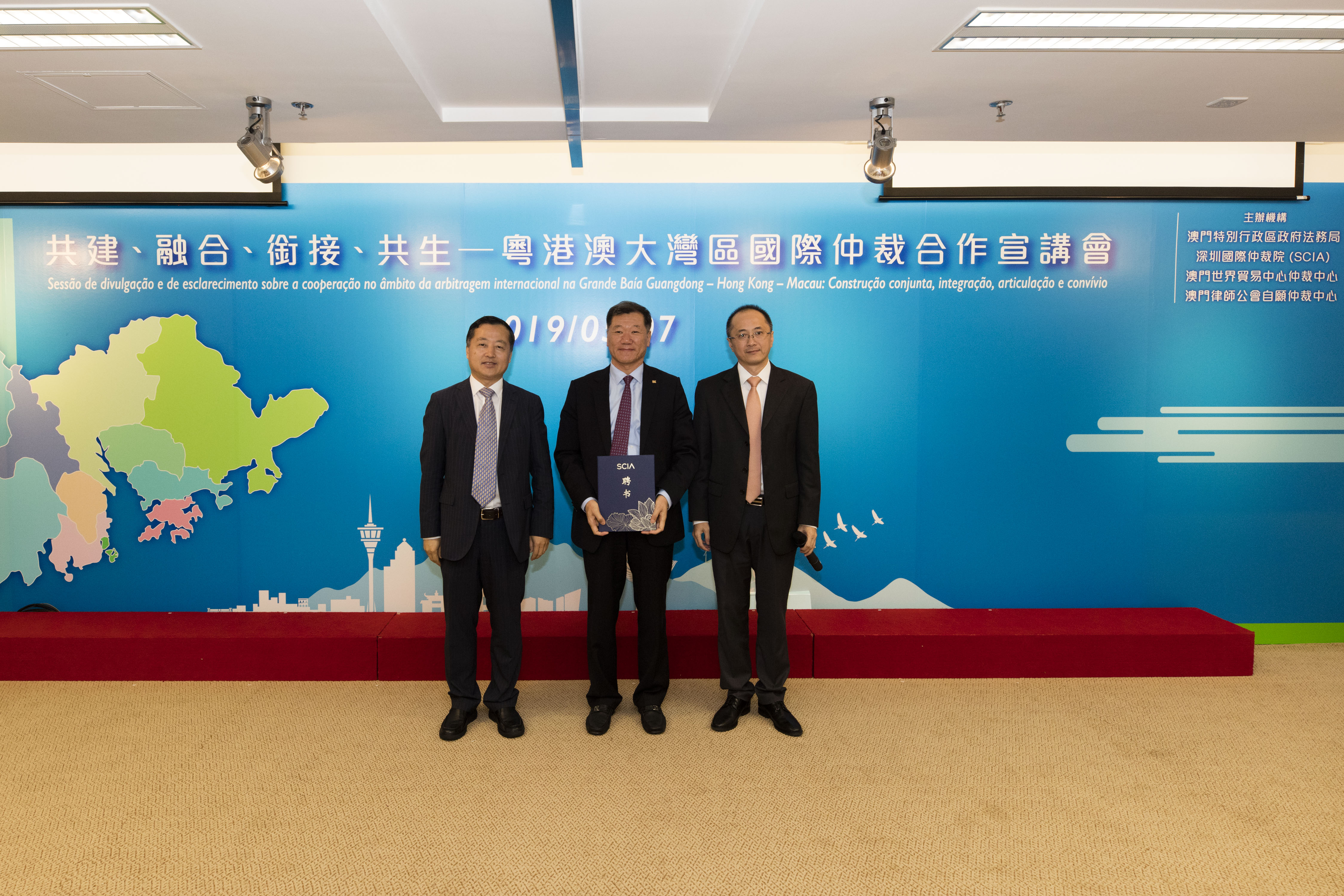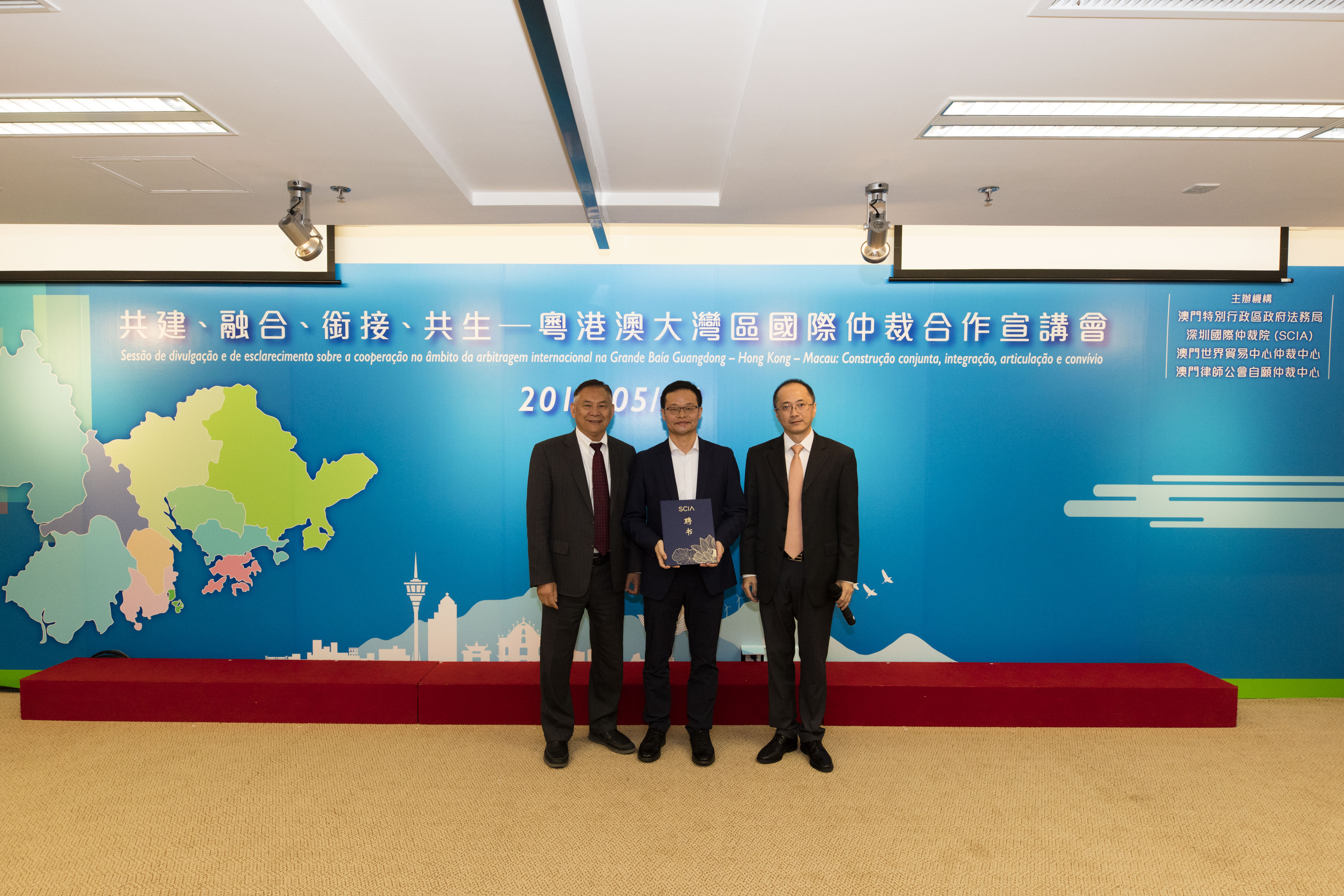 2019年5月7日,深圳国际仲裁院(又名 “华南国际经济贸易仲裁委员会”、 “深圳仲裁委员会”,英文简称SCIA)联合澳门特别行政区政府法务局、澳门世界贸易中心仲裁中心、澳门律师公会自愿仲裁中心在澳门特别行政区政府法务局大楼共同举办“共建、融合、衔接、共生——粤港澳大湾区国际仲裁合作宣讲会暨深圳国际仲裁院澳门仲裁员聘书颁发仪式”,这是在《粤港澳大湾区发展规划纲要》(下称《纲要》)出台及中办、国办印发《关于完善仲裁制度提高仲裁公信力的若干意见》后,粤澳两地首次合作举办国际仲裁主题研讨会,落实《纲要》关于“完善国际商事纠纷解决机制,建设国际仲裁中心,支持粤港澳仲裁及调解机构交流合作,为粤港澳经济贸易提供仲裁及调解服务”的要求,推动粤澳两地仲裁制度、仲裁规则、仲裁合作机制的互认、共生、融合和衔接,携手共建粤港澳大湾区国际仲裁高地。
