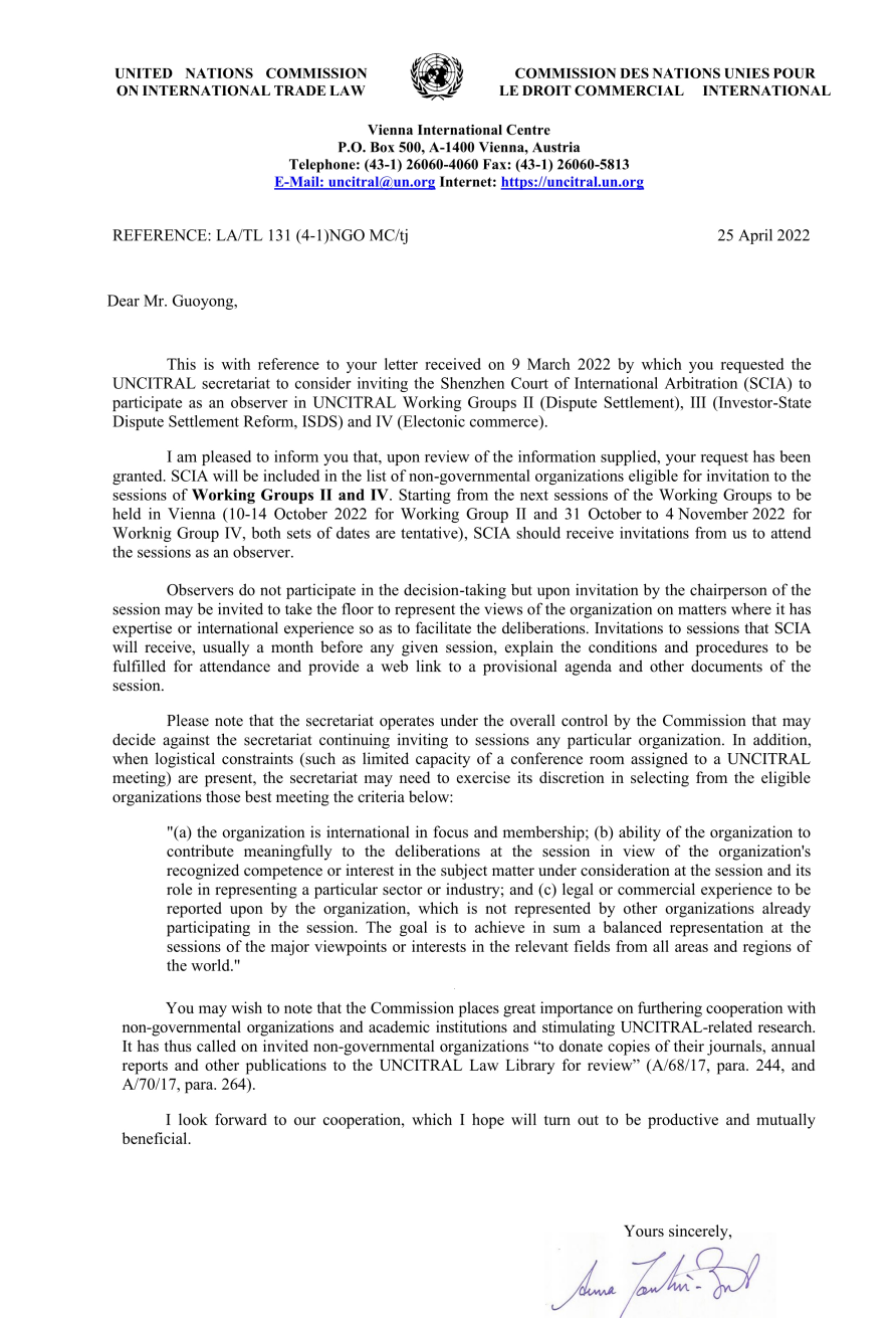 SCIA成为UNCITRAL第二、第四工作组观察员和第三工作组临时观察员。
