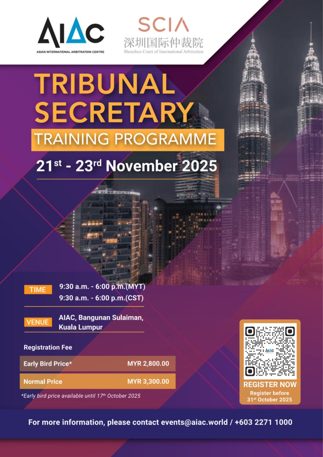 2025年11月21日至23日,由深圳国际仲裁院(SCIA)与亚洲国际仲裁中心(AIAC)联合主办的“中马联合仲裁庭秘书培训(SCIA & AIAC Joint Tribunal Secretary Training Programme)”将在马来西亚吉隆坡举行。本次培训聚焦中马国际仲裁的创新发展、SCIA及AIAC仲裁规则的理解与适用、跨法域背景下的仲裁程序开展以及仲裁庭秘书的职责要求等主要议题,邀请资深仲裁员、行业专家、资深仲裁秘书等参与授课,通过理论讲授、小组讨论、交流分享等丰富的课程,为从事中马国际仲裁业务的专业人士提供有益指引。