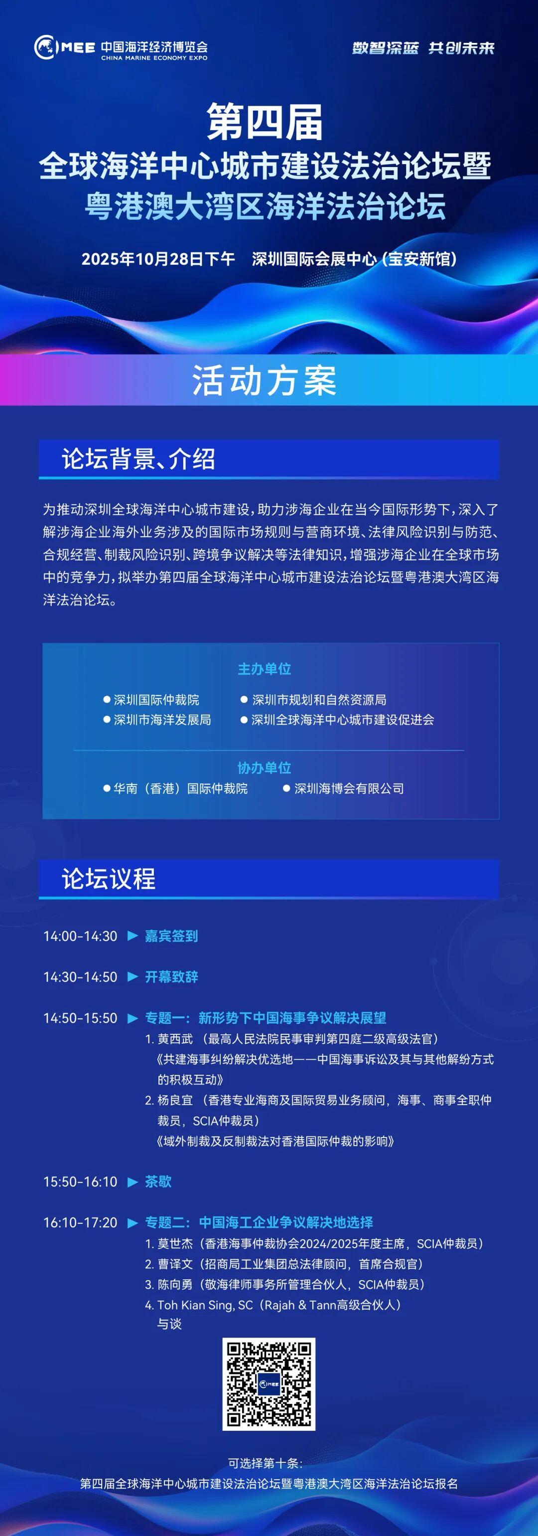 2025年中国海洋经济博览会将于近期在中国深圳开幕,作为此次国家级海洋经济展会的配套活动,深圳国际仲裁院主办的第四届全球海洋中心城市建设法治论坛暨粤港澳大湾区海洋法治论坛将于2025年10月28日下午在深圳国际会展中心(宝安)举行。论坛将聚焦跨境争议解决、外国制裁风险等相关热点问题,为建设全球海洋中心城市贡献智慧。诚邀您的参与!