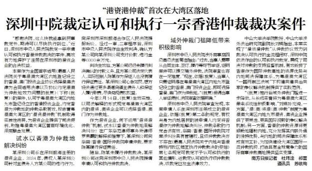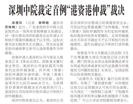 人民法院报:深圳中院裁定首例“港资港仲裁”裁决