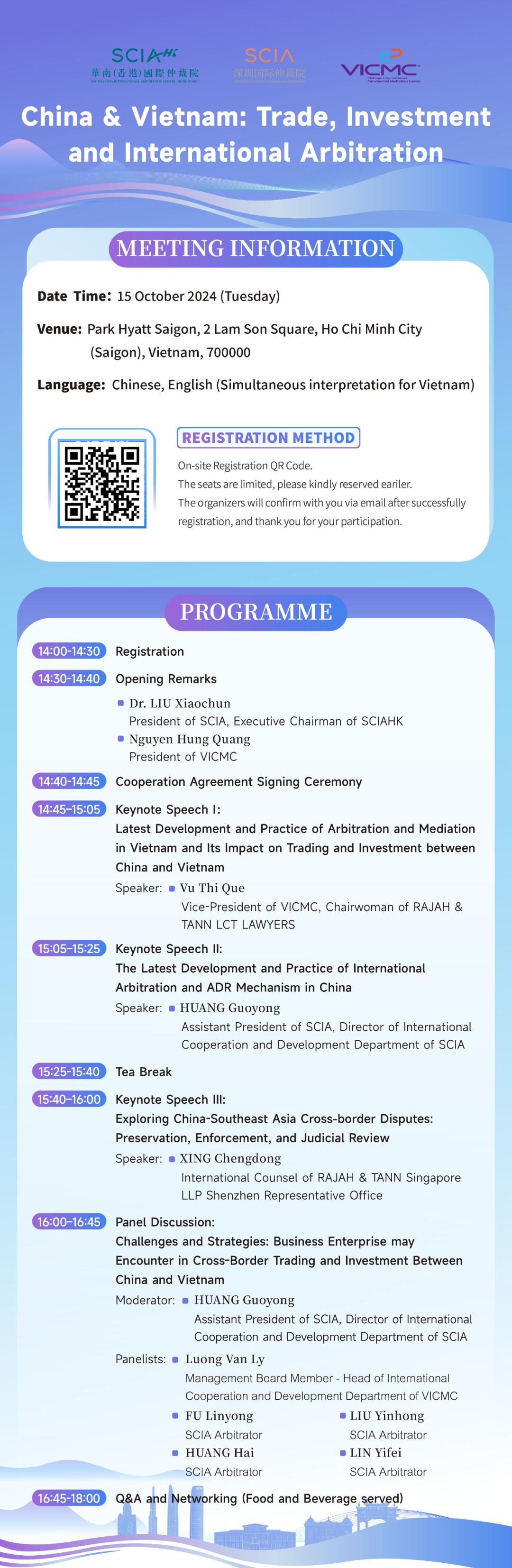 The Seminar on “China & Vietnam: Trade, Investment and International Arbitration” co-hosted by the Shenzhen Court of International Arbitration (SCIA), South China International Arbitration Center (Hong Kong) (SCIAHK) and Vietnam International Commercial Mediation Center (VICMC) is being held on October 15, 2024 in Ho Chi Minh, Vietnam.