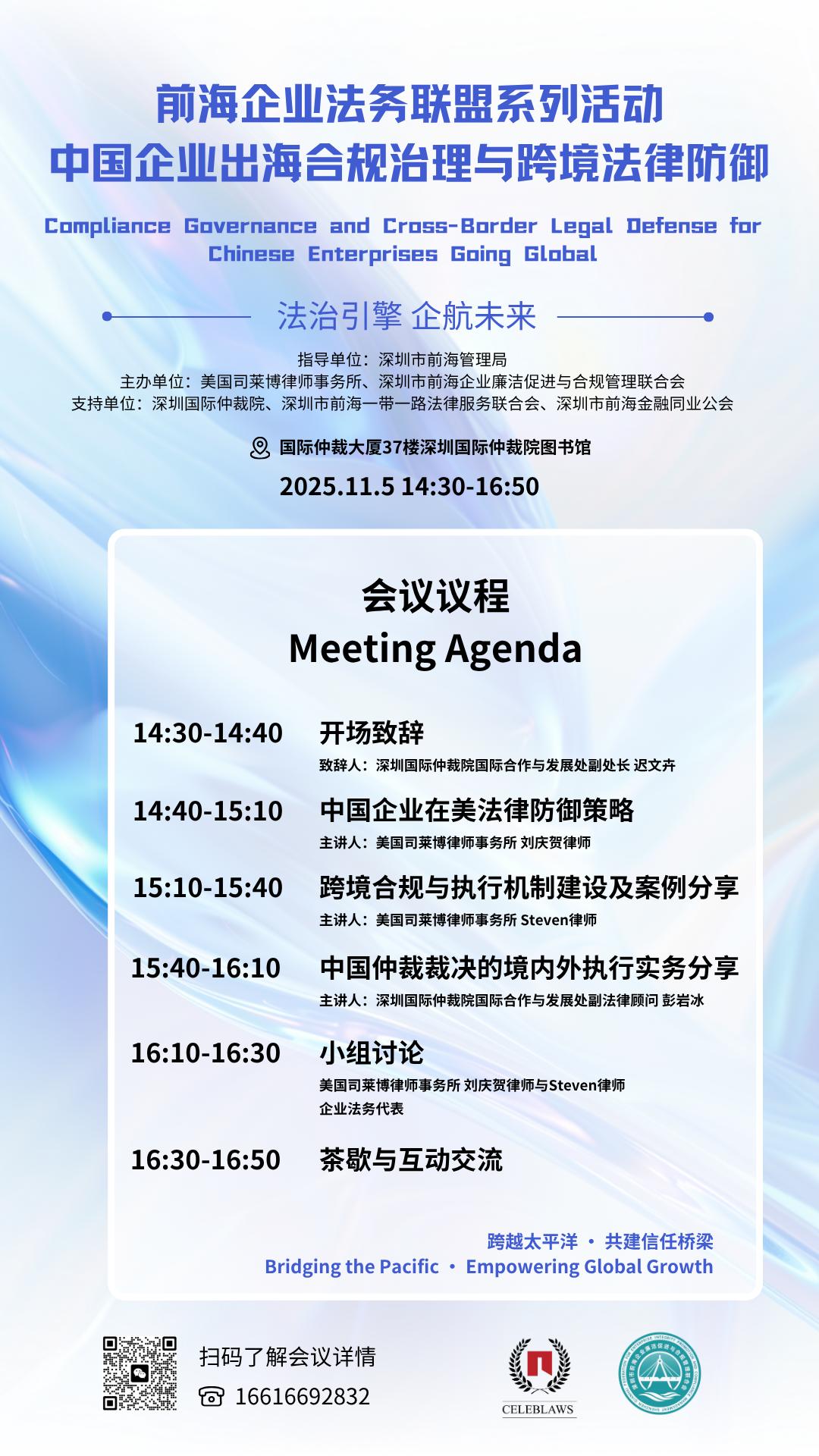 2025年11月5日下午14:30-17:10,深圳国际仲裁院(SCIA)支持由深圳市前海管理局指导,美国司莱律师事务所、深圳市前海企业廉洁促进与合规管理联合会主办的“前海企业法务联盟系列活动:中国企业出海合规治理与跨境法律防御”将在深圳国际仲裁院前海总部,国际仲裁大厦37楼举行。