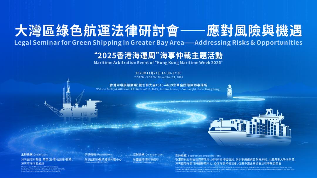 一年一度的香港海运周即将来临,由深圳国际仲裁院(又名华南国际经济贸易仲裁委员会、粤港澳大湾区国际仲裁中心,英文简称“SCIA”)与华南(香港)国际仲裁院(英文简称“SCIAHK”)联合主办的“2025香港海运周”海事仲裁主题活动“大湾区绿色航运法律研讨会——应对风险与机遇”将于2025年11月21日在香港召开,本次活动聚焦中国及世界航运碳减排、绿色航运的法律实务和理论思考,诚邀粤港澳大湾区海事海商领域产业界和法律界人士进行现场交流,活动信息如下: