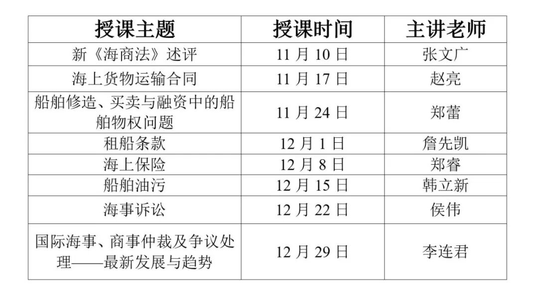 值此新修订海商法公布之际,为服务“一带一路”与海洋强国建设,加强涉外法治人才培养,深圳国际仲裁院与中国社会科学院大学共同开设“海商法(理论与实务)”合作课程。该课程由中国社会科学院海洋法治研究中心牵头,邀请8位知名海商法专家轮流进行教学。