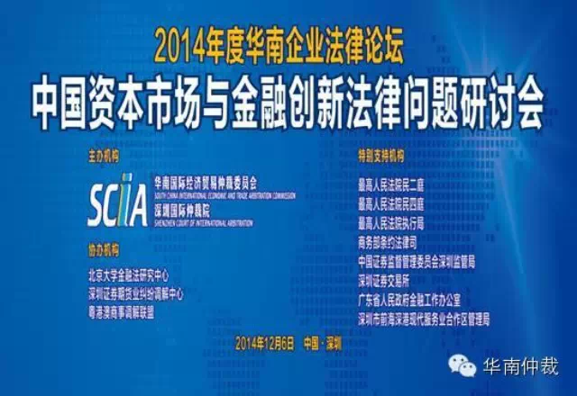 编者按:2014年12月6日,华南企业法律论坛2014年年会暨“中国资本市场与金融创新法律问题”研讨会在深圳证券交易所新大楼召开。研讨会由华南国际经济贸易仲裁委员会(深圳国际仲裁院)主办。最高人民法院民二庭、民四庭、执行局,商务部条约法律司,中国证监会深圳监管局,深圳证券交易所,广东省人民政府金融办和前海管理局是本次研讨会的特别支持机构。北京大学金融法研究中心、深圳证券期货业纠纷调解中心和粤港澳商事调解联盟为研讨会协办机构。参加会议的代表共500余人。来自22个省份46个城市的200多家上市公司高管,以及近300名境内外知名互联网企业和金融机构高管,与各级法院法官、仲裁员、调解专家及中国证监会、银监会等监管机构的相关负责人共聚深圳证券交易所,进行了深入的交流研讨。