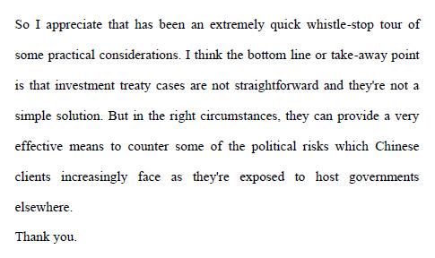 以上就是我对投资仲裁的一些实务思考。我觉得我们最需要关注的一点就是,虽然投资条约案件并不容易,也没有简单明了的解决方案,但是如果运用得到,投资仲裁可以成为中国客户处理自己与东道国政府打交道时面临的政治风险的一个非常有效的方式。谢谢!