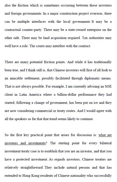 首先,我们已经看到中国投资者对外投资的兴趣在不断高涨。当我在跟中国投资者讨论对外投资的时候,他们往往最关注的一点就是条约仲裁。我认为这是对外投资的不断增长和条约权利意识的增强所带来的结果,当然也跟投资者与外国政府偶尔产生的摩擦有关。比如,投资者投资国外大型建筑工程时,投资合同的当事人有时是政府,有时是国有企业。在这类项目中,投资者会与当地政府发生多种互动:可能会涉及到土地权利的取得,可能牵涉税务机关,也可能会受到法院的介入。