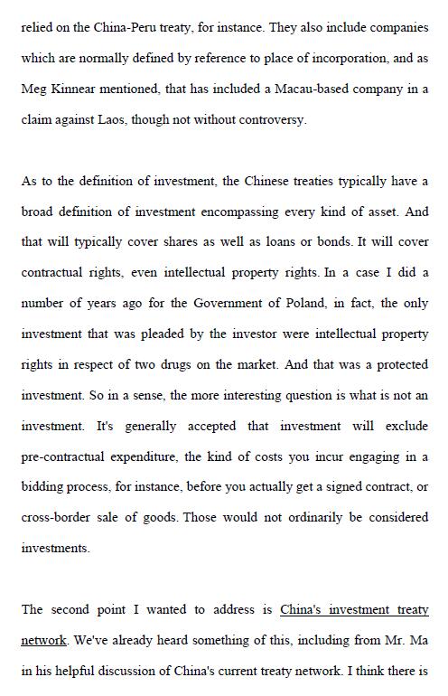 就“投资”的定义来说,中国的投资协定对于投资的定义比较广泛,通常包括公司股权以及贷款或债券,甚至涵盖合同权利和知识产权。几年前我代表波兰政府代理过一件案件,是关于两种药物的知识产权方面的纠纷。其实,更有趣的问题是:什么不能称为“投资”?比如签订合同前的支出,像投标过程中花费的成本,或者是跨境销售货物,这些通常不被视为投资。