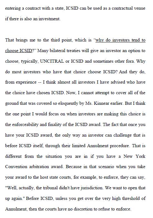 这正是我想讨论的第三点,为什么投资者倾向于选择ICSID?许多双边条约给投资者提供选择,通常是UNCITRAL或ICSID,或一些其他平台。在这些选择中,ICSID用什么赢得了我多数客户的信任?我认为最根本的原因是因为ICSID的裁决具有可强制执行性和终局性。因为一旦你获得了一个ICSID裁决,挑战这个裁决的唯一途径是向ICSID申请启动一个非常有限的撤销程序,这跟《纽约公约》项下裁决的情形是不同的,因为在这种情形中,当你把裁决提交东道国法院申请执行时,他们可能会说:“嗯,实际上,该案仲裁庭并无管辖权。我们要重新审查该案。”而在ICSID,除非你能达到ICSID撤销程序的极高门槛,否则法院无权拒绝执行ICSID裁决。