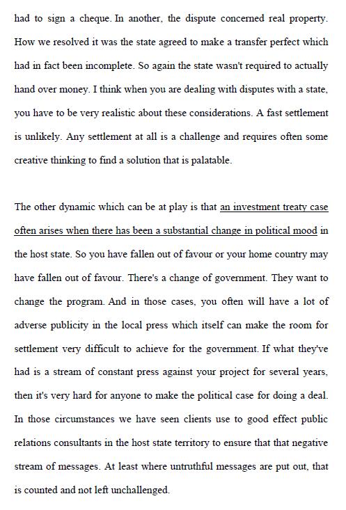 另外一种情况是,在东道国政治环境有非常大的改变的时候,就会产生大量的投资条约案子。有可能是因为投资者或者投资者的母国已经不被东道国支持了,投资者经常会被当地的新闻进行不利宣传,这样会使得政府很难有与投资者和解的空间。在这种情况下,我们看到客户在东道国聘请优秀的公关顾问,排除负面或者是不真实消息给投资者带来的不利。